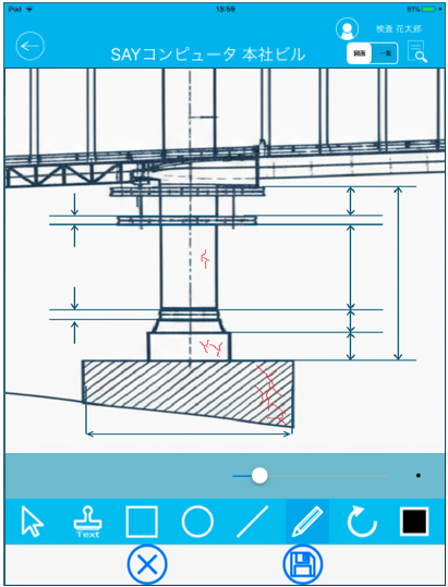 タブレットに表示した橋梁図面上にタッチ操作で損傷箇所をマーキングしたり、キーボードや手書き入力でコメントを残したりできます。